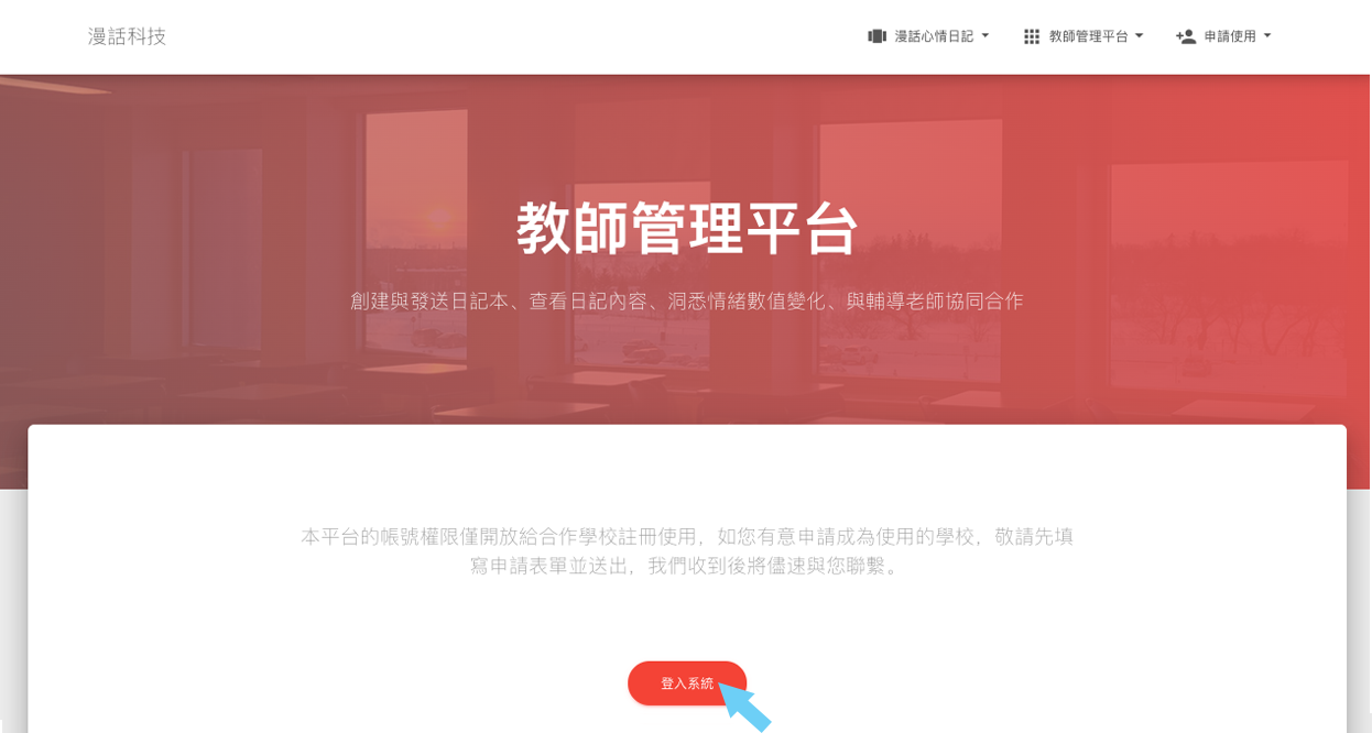 <figure><img src="https://845691862-files.gitbook.io/~/files/v0/b/gitbook-x-prod.appspot.com/o/spaces%2Fa7uaO10LjrLx2oBx1W9b%2Fuploads%2FL9Y5mfIQ1J0dIe4ZOG1r%2Fimage.png?alt=media&#x26;token=841fb810-b77b-49a7-9ebe-3832edfddf74" alt=""><figcaption><p>圖1. 在首頁點選登入系統按鈕</p></figcaption></figure>