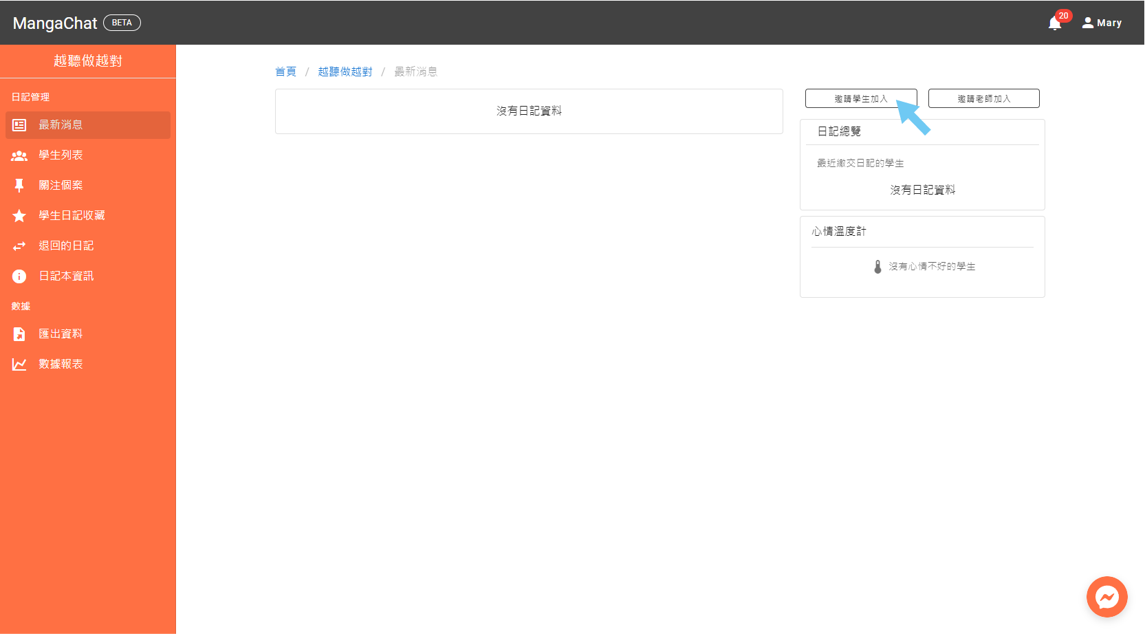 日記本創建成功後，會直接進入此日記本的管理畫面，選擇右上角的「邀請學生加入」。
