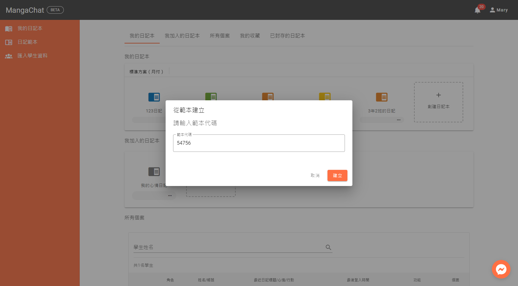 若是學生尚未註冊，在註冊時可直接填入日記本代碼，註冊完成後系統會直接匯入，就可以直接使用此日記本。（詳細說明請參閱[漫話日記使用手冊－如何註冊](https://spiculate.gitbook.io/mangachat/hui-yuan-zhu-ce-yu-deng-ru-1/ru-he-zhu-ce)）