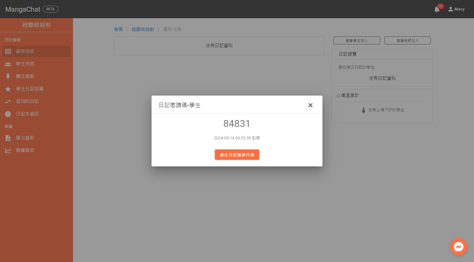複製畫面中的日記邀請碼提供給學生使用。邀請碼過期後會失效，可以再回來此頁產生新的日記邀請代碼即可。