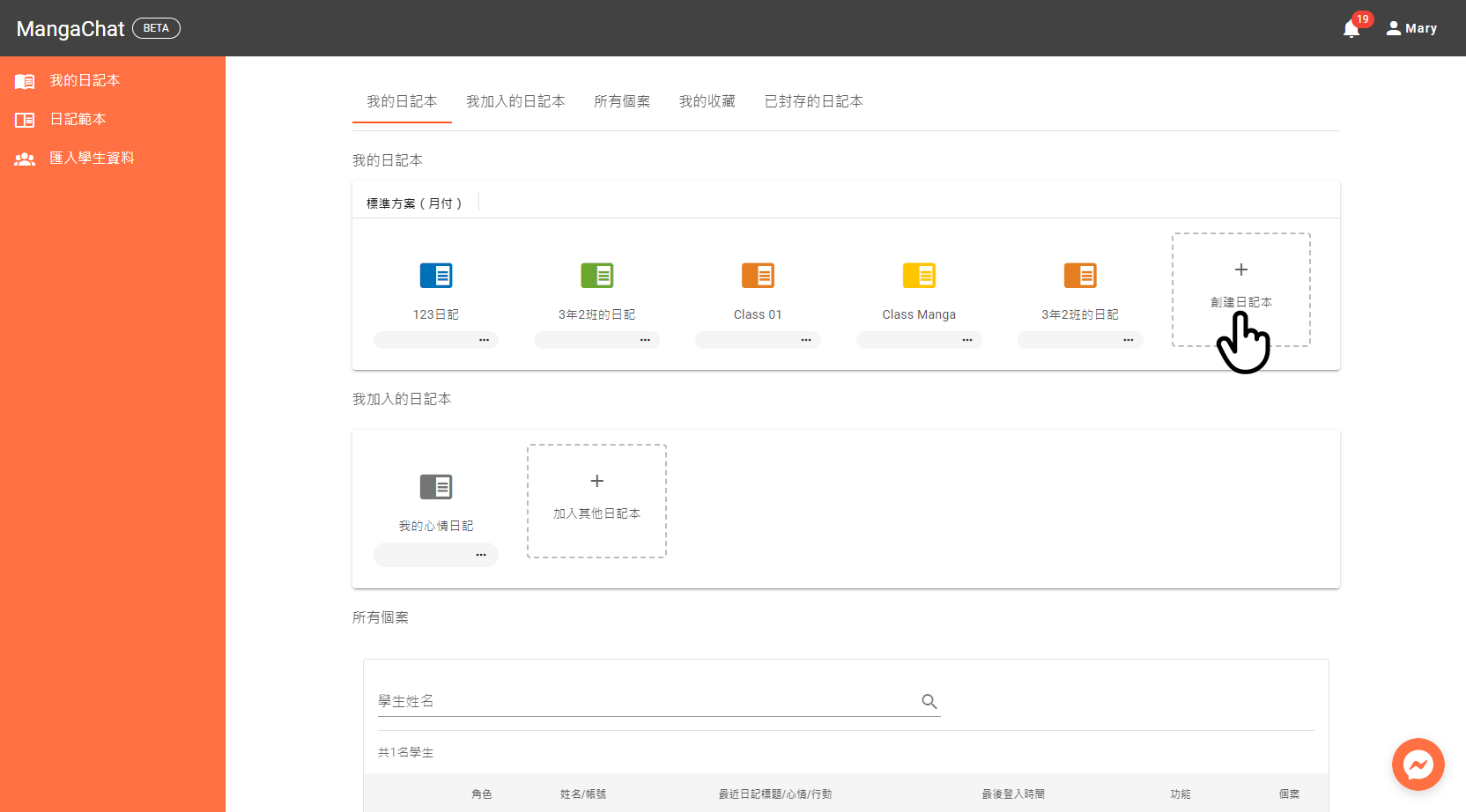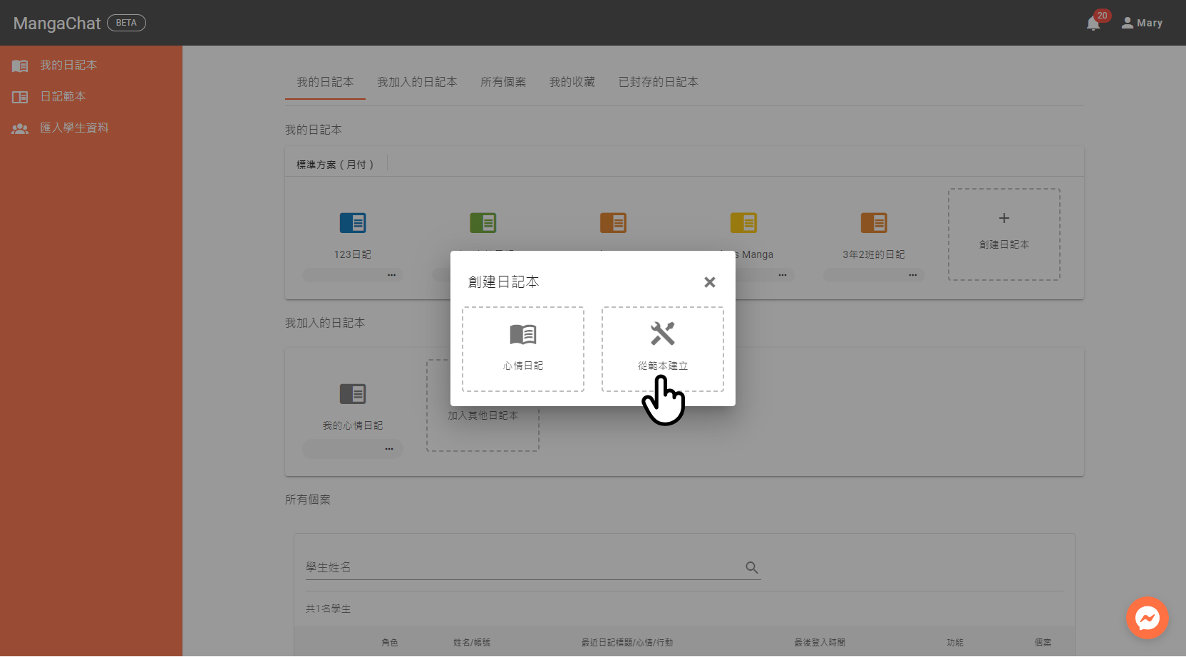 若學生已在漫話心情日記平臺註冊完成，則可以在首頁點選「+」新增日記本，並輸入日記本代碼後領取。（詳細說明請參閱[漫話日記使用手冊－建立日記本](https://spiculate.gitbook.io/mangachat/bian-ji-ri-ji-1/jian-li-ri-ji-ben)）